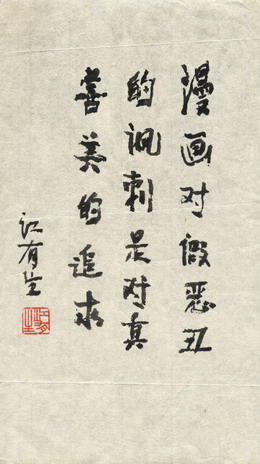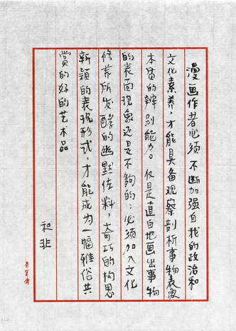 有了漫画家们的孜孜以求还不足以成气候,还有赖众多的漫画工作者、媒体、社会活动家、收藏界人士等等以举办展览、搞拍卖会、出画册、媒体推广宣传等等方式使水墨漫画为更多的人们了解和喜爱,期待这一日早早成观。以此与漫界同行共勉。