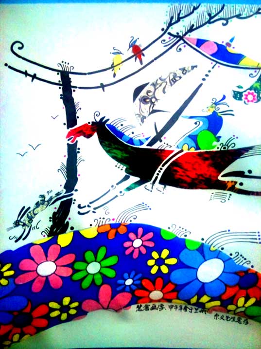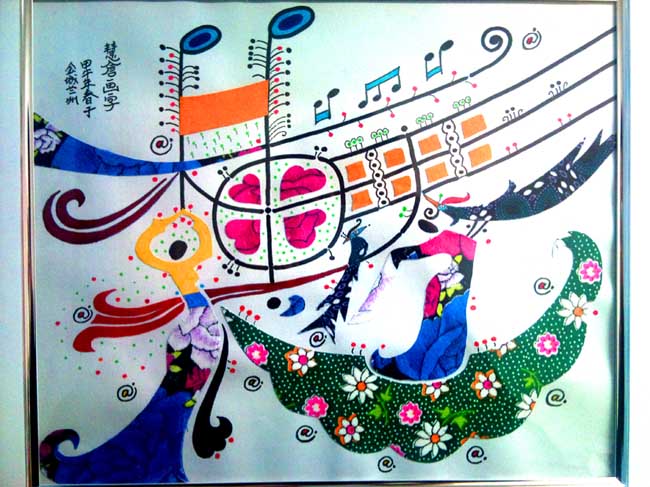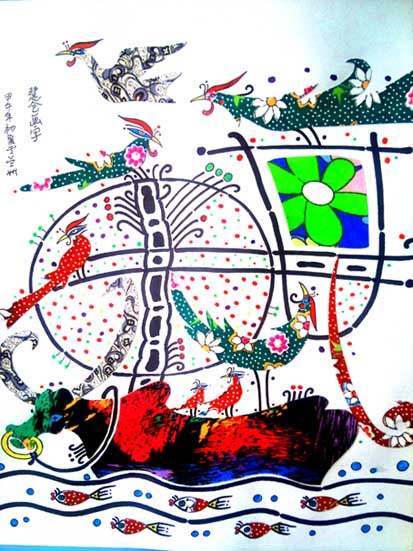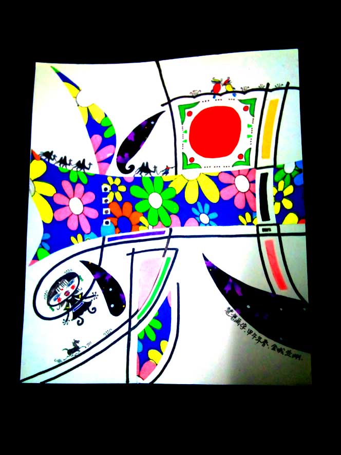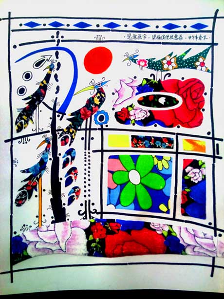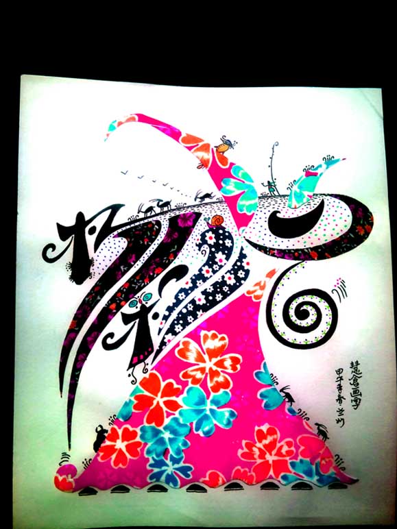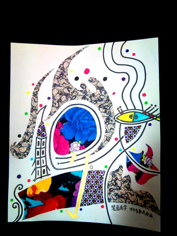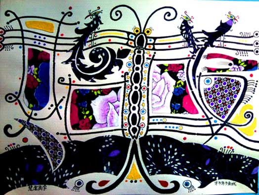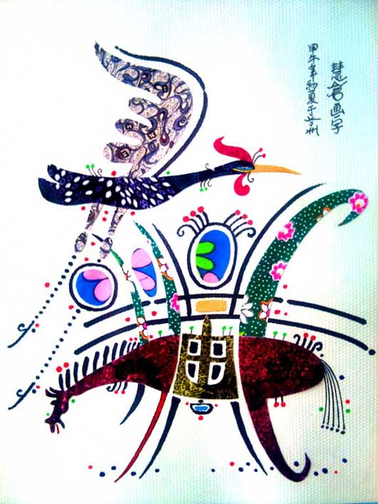 曾经在重庆旅游景点看到姓名篆书纪念礼品,深受感染,后来又看到黑马大叔的彩墨画字,很受启发。我想,汉字本身由象形文字演化而来,特别是甲骨文,更是一种广义的图画了,我就想,能不能倒推回去,返祖一把---把现代汉字变成一副美轮美奂的图画?!都说书画同源,然而在传统的书画作品里,图画和书法(题款和印章等)虽然在同一个空间,甚至有呼应关系,但是,总的看来,绝大部分国画作品里面,字和画还是相对分离、相对独立的,并未达到书画互为肢体,融为一体的理想境界。有鉴于此,我希望从形式上有所突破,有所创新。而姓名字画给了我一个灵感和机缘,给了我一个现成的线索和思路,于是我天马行空,想入非非......当然,我不会把姓名字画当成街头杂耍那样对待,比如明星签名或者民间艺人那样的“为字而字”,我希望小中见大,把姓名创意画变成一个高品位的艺术品,把我多年对各门派艺术的理解和感悟藉此形式表达出来!我更喜欢西方现、当代艺术里面一些抽象写意表现的处理手法,比如毕加索、达利、米罗、克利等超现实主义,还有莫奈等抽象主义风格、马蒂斯色彩艳丽的表现主义风格、克里姆特、陕北刺绣的华丽装饰风格、梵高、几米作品的律动感、自然清新感......以及敦煌壁画、民间剪纸的韵律感、汉画的古朴浪漫......等等,可惜许多东西难以消化吸收,更难以推陈出新,手到擒来,美梦成真,只好邯郸学步,半生不熟,且行且提高......
