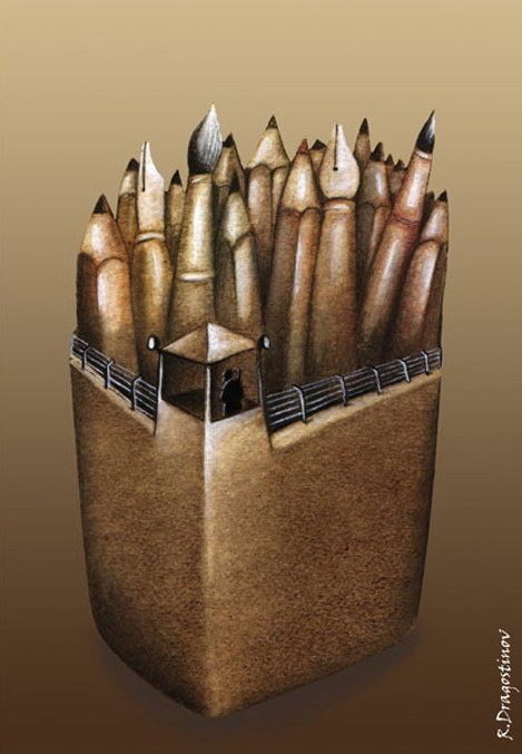 上高中时,我去了县城,在学校办了几期黑板报,老师说我有画画的天赋。这话让我父亲知道,便给我请了一位专业美术老师,让我跟着学习,将来报考美术学院。学了几天就对画画没了兴趣。什么素描、水粉、速写都让我难受。看着老师摆布的瓶瓶罐罐就瞌睡。后来干脆就不去学了,父亲骂我没出息!可是,闲的时候,我依旧画那些我喜欢的人和事,画了厚厚的一本子,有次,在课堂上偷偷的递给前面座位上的一个女生,她低着头一页一页翻着,突然笑得浑身发抖,接着就笑出了声……同学都回过头盯着她,老师走过来骂了一句:“神经病!”没收了我的画册。讲完课,老师爬在讲台上翻起了我的画,看着看着也忍不住笑着跑出了教室。事后,老师把我叫到办公室,说:“你是个画漫画的料,以后可以给报社投稿。”