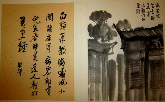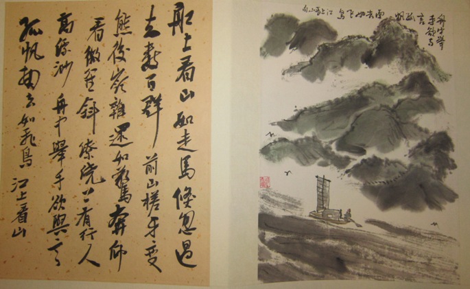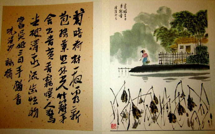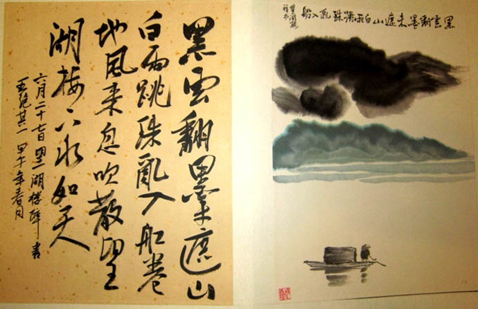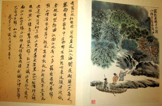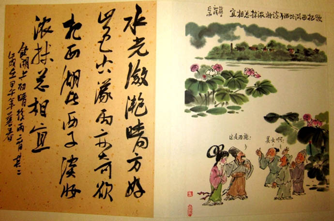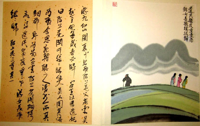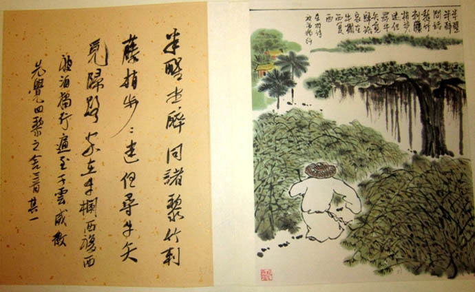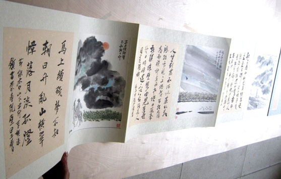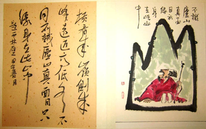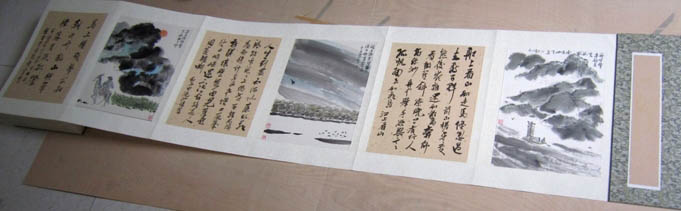 去年底由由北京中华书局出版了一本<<苏轼诗词写意>>,我作诗意画90幅,根据诗词意境,或山水,或人物,或花鸟,或漫画,技法更是不拘一格,大写意,小写意,彩墨画,纯水墨.....书出版后,90幅原还在我手上,为便于保存,托一书法朋友将90首诗词不拘一体写出,合计书画180幅,再托人制成一本册页。长宽42x30cm,厚10cm。