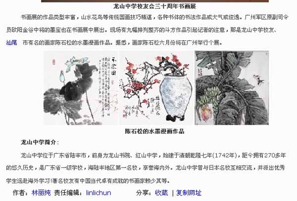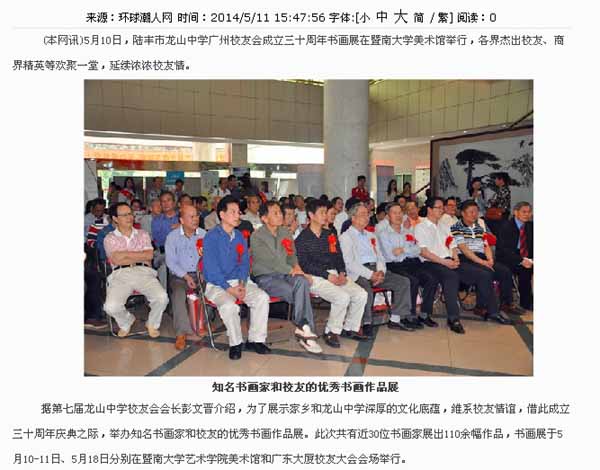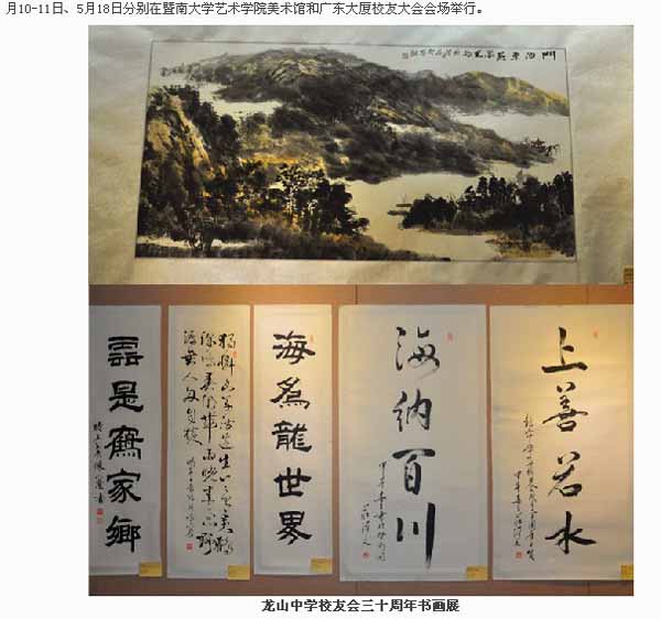 陆丰龙山中学广州校友会成立三十周年书画展定于5月10曰上午10点在暨南大学美术馆(曾宪梓科学馆一楼)举行开幕式。 近30位书画家(大部分是汕尾籍人士和龙山校友)惠赐展出的书画作品有110余件,各位书画家将出席开幕式。 广州军区原副司令员欧阳金谷中将也挥毫赐字展出,杰出校友、省科技厅原厅长谢明权将出席开幕式并致词,还有一批原厅局级领导和各界杰出校友、商界精英等出席开幕式;其中画家陈石松先生展出8幅作品。 届时,校友会将向到会的各位嘉宾和校友赠送书画展作品集、校友通讯录和养生资讯集。敬请您拨冗莅临5月10日上午10时的书画展开幕式指导!感激! (暨大艺术学院美术馆地址:从黄埔大道西601号暨南大学南门进来前行第一个路口左转,前行近100米至右边第一个路口右转,再前行200米可见左边空旷草地旁的科学馆大楼)举报 回复# 2楼
