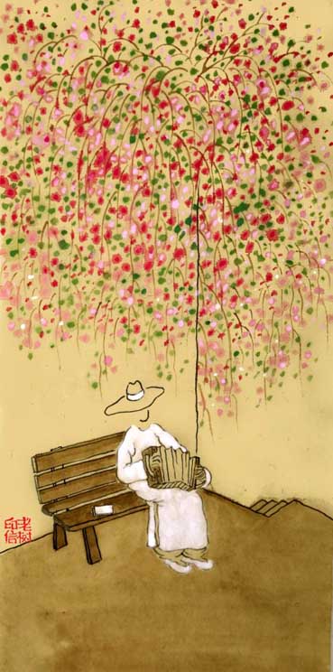 刘树勇作品北京有大雾,心情不大好。前去见朋友,云里雾里找。晨报记者 徐颖“今日又开会,好像挺复杂。一句也没听,在想那丛花。”“傍晚残阳已西沉,街角老者弄胡琴。最是苍凉二胡调,一把一把说前人。”“此生所忙何事?垂钓水中云影。说破真是无趣,接着掩耳盗铃。”在微博上,每天上传一幅画,没加V的“老树画画”,短短几个月中迅速成了热门ID。