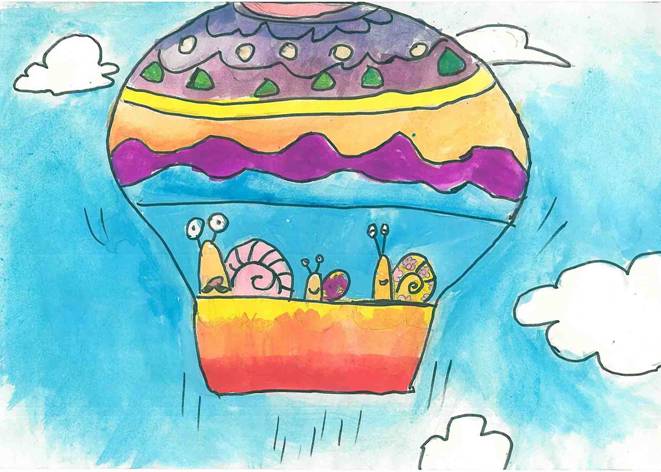 如《蜗牛一家去旅行》(图一),我是这样简述的:蜗牛一家很想出门去旅行,想去北京看看长城和故宫,想去上海看看世博会,也想去杭州看看西湖……但苦于自己先天的不足。最后,靠着自己的智慧,做成一个大大的热气球,如愿地实现了出远门旅行的梦想。