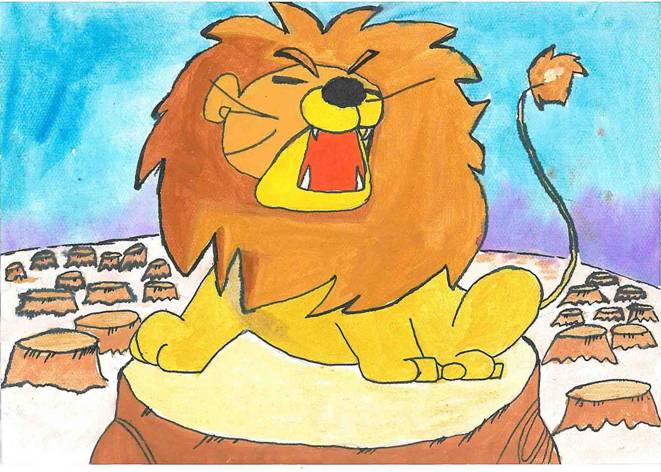 接着,又简述《——还我森林》(图三)这幅画的童话故事:大狮子想回到从前的森林去看看,顺便再体验一下过去那快乐自由的生活。它向动物园里的管理员提出了申请。管理员立马答应了它的请求。大狮子高兴极了,一路欢快地跑着。当大狮子来到自己的故乡时,它愣住了:家园呢?怎么成了一片荒芜的烂树桩?愤怒的狮子站在树桩上大吼:“还我森林!”