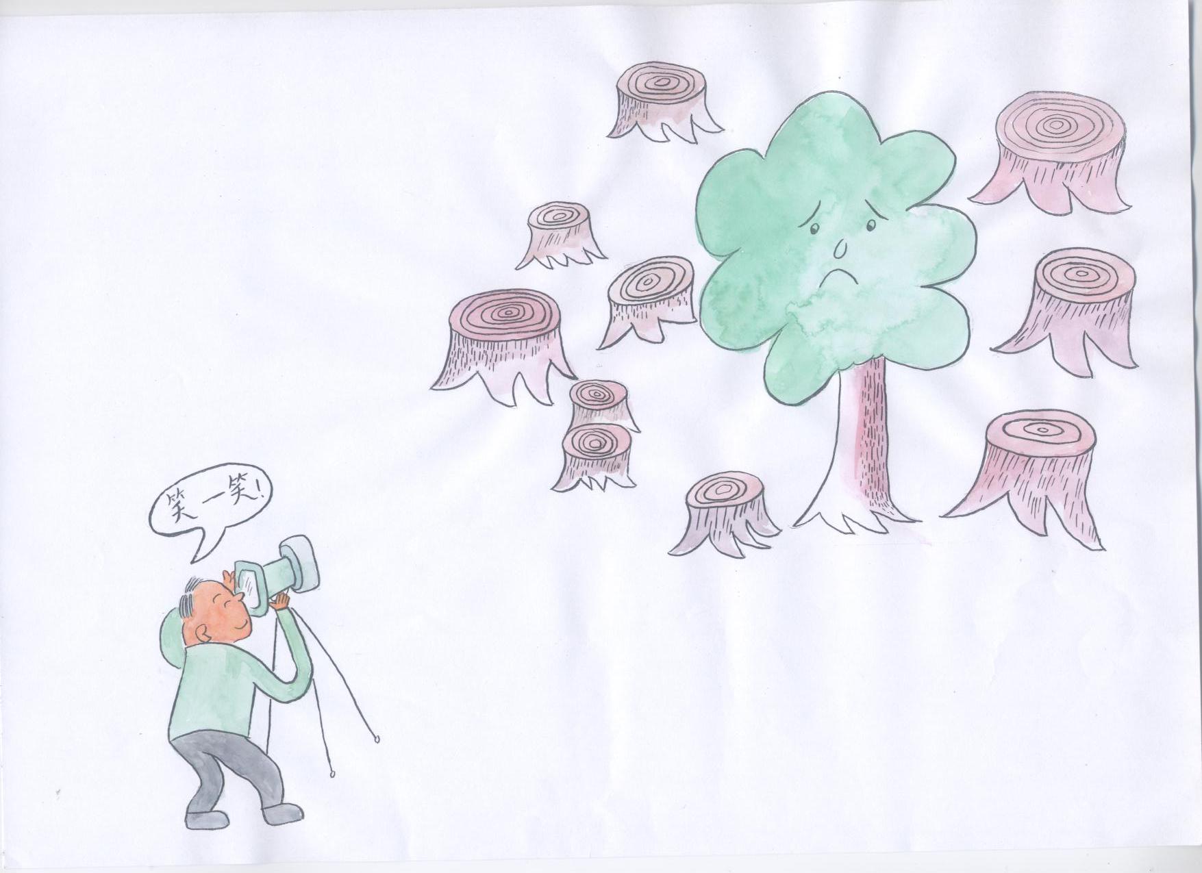 例二, 再如:一生的爸爸是搞照相的,以往照相的人给人拍照时都喜欢习惯地说一句“笑一笑”。这个学生由此联想到给树照相也喊一声“笑一笑”,并画出初稿。后来这个学生又觉得单调,她由初稿再思考:爸爸叫树笑一笑,树会笑吗?树笑不起来。为什么笑不起来呢?再后来,这个学生又把这棵树置于特定的环境中了——周围的同伴树都被砍伐了!(见图二)由此,一幅含义深刻的漫画作品成功了!