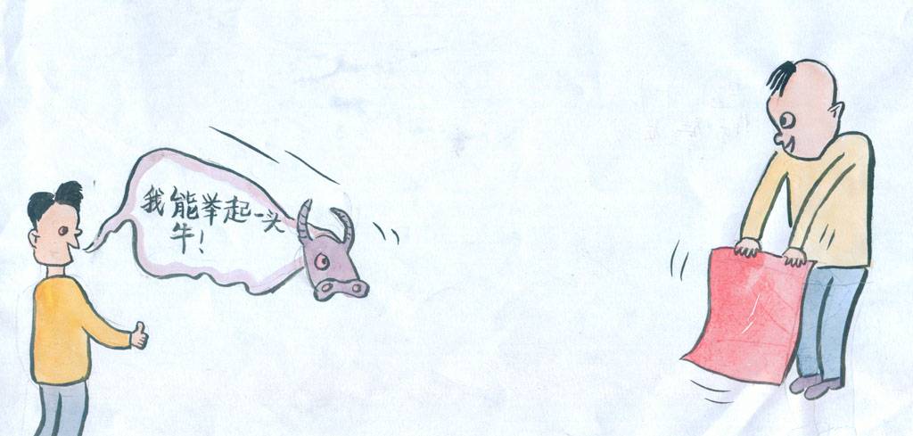 例一, 如:由“牛”这个动物联想到各种“牛”——奶牛、耕牛、蜗牛、电子牛、吹牛……如果再由“牛”联想到“斗牛”这一现象嫁接连接就有趣了:斗奶牛、斗蜗牛、斗电子牛、斗吹出来的“牛”……画出其中有趣的“斗牛”都是一幅有趣的画了。(见图一)