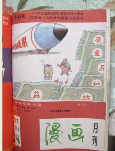 第一幅,孙子漫画展,作者孙琪献,2013年。第二幅,1991年漫画月刊封面,作者张宏林。