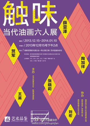 继2013年11月“风之迹”油画展后,《艺术品鉴》杂志社再次于2013年12月15日至2014年1月10日在杂志艺术中心举办“触味”当代油画六人展,在冷空气吹散雾霾之后的阳光灿烂之中,在安静的都市一隅,告别2013,迎来2014。