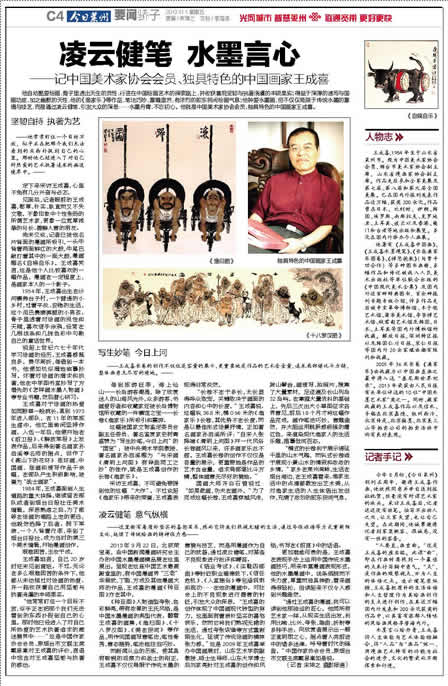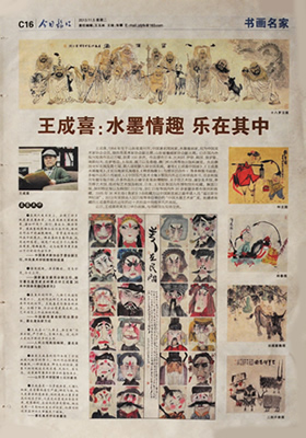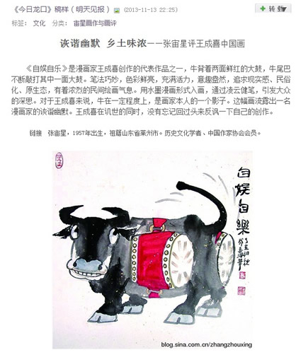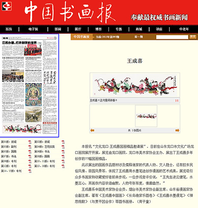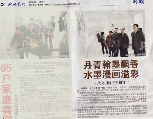 本报讯 2013年11月8日至15日,由山东省龙口市美术家协会、龙口画院主办的“文化龙口--王成喜国画精品邀请展”在龙口市文化广场龙口画院展厅举行。共展出王成喜中国画、水墨漫画近80幅。