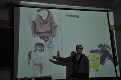 曹鸣喜院长首先给大家介绍了王成喜教授。随后,王成喜教授展示了自己创作的作品,现场师生被王教授创作的一幅幅栩栩如生的国画和漫画作品所吸引。为了让大家更好地理解作品的创作方法,王成喜教授对每一幅作品的创作背景和创作构思,进行了详细讲解;对中国画的基本知识点、漫画的绘画技巧等进行了讲授。整场讲座内容丰富,异彩纷呈,掌声不断。