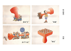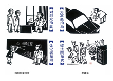 鼓励什么?鼓励漫画要讲究文学性。从题目看,有借典化用出巧生趣之意。这个用典是借明代著名传奇话本短篇小说集《初刻拍案惊奇》和《二刻拍案惊奇》,李建国自己来续作《四刻拍案惊奇》。画中四“拍”,很能够与“四刻拍案惊奇”切题,颇得生趣。《初刻拍案惊奇》和《二刻拍案惊奇》与《喻世明言》、《警世通言》、《醒世恒言》合称“三言二拍”,意义在于喻世、警世、醒世。李建国的漫画,内容讽刺,其实也在喻世、警世、醒世。