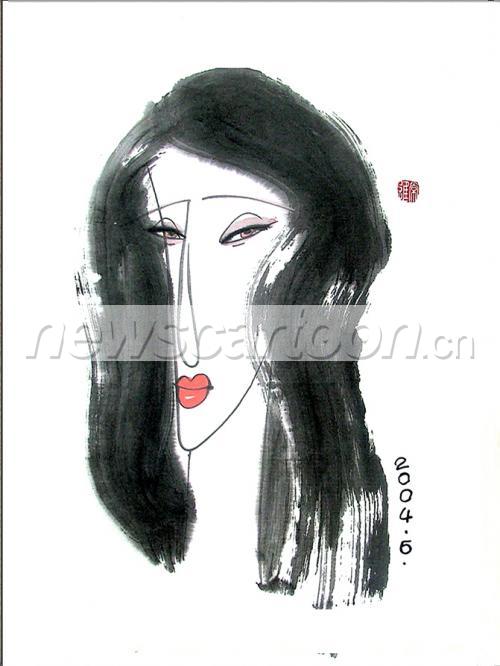 这是常进先生的水墨肖像创作。我甚至害怕使用“漫画”二字,真怕这“漫”字唐突冒昧了这位美人。画家以极其简约的笔墨画出的美人,是美的精灵,有着忧伤泣影的精灵。她美,你真的想拥抱她,但又害怕庸俗的手有损了她,也就只能深深的爱在心里,悯惜在心里。为什么要悯惜,因为她是病西施。如果我真的邂遘了那位西湖美人,即使想拥抱她,却绝不会生出悯惜,好像她本来就是供拥抱而存在。常进先生笔下的这位病西施,之所以使人悯惜,先生告诉了我们,她是白领丽人。于是,白领丽人的种种艰辛与忧伤便牵动我们的想象。《白领丽人》好题目,给这幅肖像增添了时代信息的主题,自然也就扣动了我们的情思。那些废纸千张,虽然毛发并呈,无主题、无灵魂的肖像,为什么反倒不能扣人情思?本来百思不得其解的问题,看了常进先生的这幅水墨肖像,似乎已经有了答案。