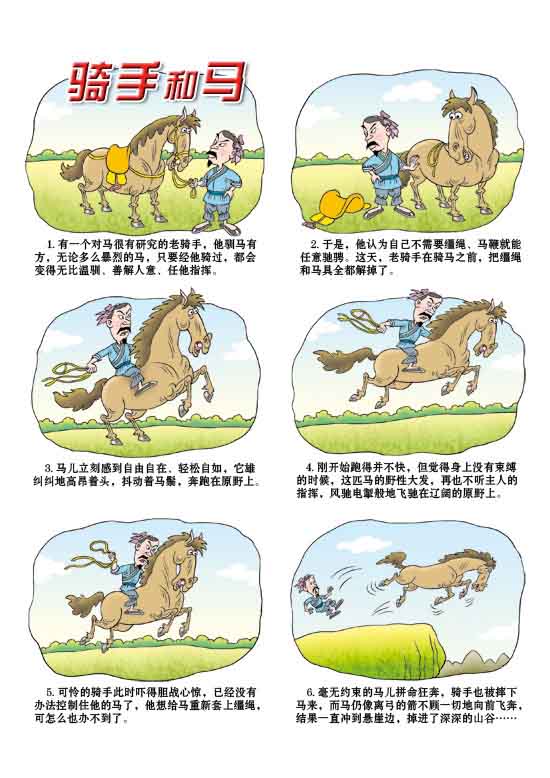 经过紧锣密鼓的铺垫,最后抖出意义。根据前面的铺垫逻辑,结局有可能是人摔马跑,那么思想意义就浅了;第二种结局是人摔马摔,这就思想深刻了。这个意义因其具有普遍性,所以对现实颇有谏议的意义。好作品不在华丽,而在深刻。