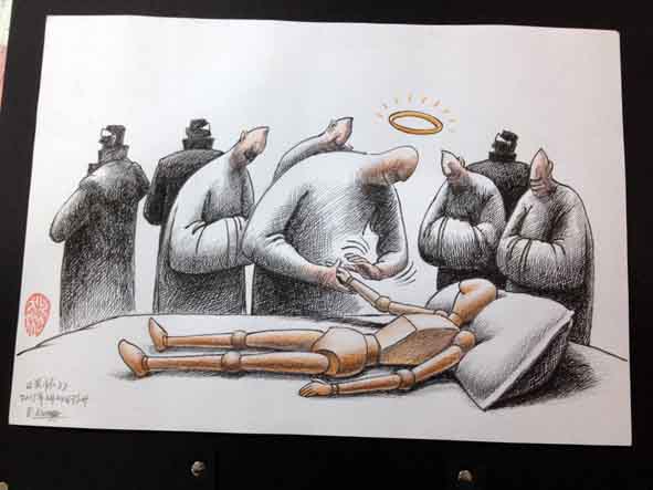 就漫画发展方面的问题,我深感与我们漫画界组织领导层的惯性思维不无关系,特别是传统的讽刺幽默漫画领域,长期以来,我们一直强调“社会担当”、“责任感”、“艺术为人民服务”,无疑是作茧自缚,画地为牢,甚至有不少漫画前辈对谐趣搞笑的漫画题材排斥苛责,在一定程度上影响了大多数传统漫画人的价值取向及创作方向。因为,那不是以人为本,而是以国家和社会为本,所谓的“治国、平天下”,我们企图把自己当成政治家,却往往为政治所累。我们忽视了“修身、齐家”,抑制了个性和创造力。事实证明,生活类、娱乐性的连环漫画、故事漫画和绘本漫画更具持续性和生命力,也更容易走向动画行业,最终达到更大的社会效应及经济效益。大家可以说我过于功利主义,但对于当前新闻出版体制下的自由漫画人,这条道路可能会更现实一些,所谓经济独立,思想自由,人身洒脱,是要有基本的物质保障的哦。当然,路要靠自己选择,事要靠自己实干,天时、地利、人和,还要看个人的造化。我今年40多岁了,回顾近20年的创作道路,在慨叹“少壮不努力,老大徒伤悲”的同时,免不了要怀疑我自己的智商和艺术天分,甚为惭愧。不过,当我发现更多的80后、90后在漫画创作上的成就时,我会倍受鼓舞,会认真的研究、学习他们的思路和方法,我常会问自己:是否说明,方向比努力更重要?方向,是需要思量的,努力,也是必须的。“莫等闲,白了少年头,空悲切”,嘿嘿,还是打起精神,像夸父逐日一般,追求我们的“中国梦”吧......